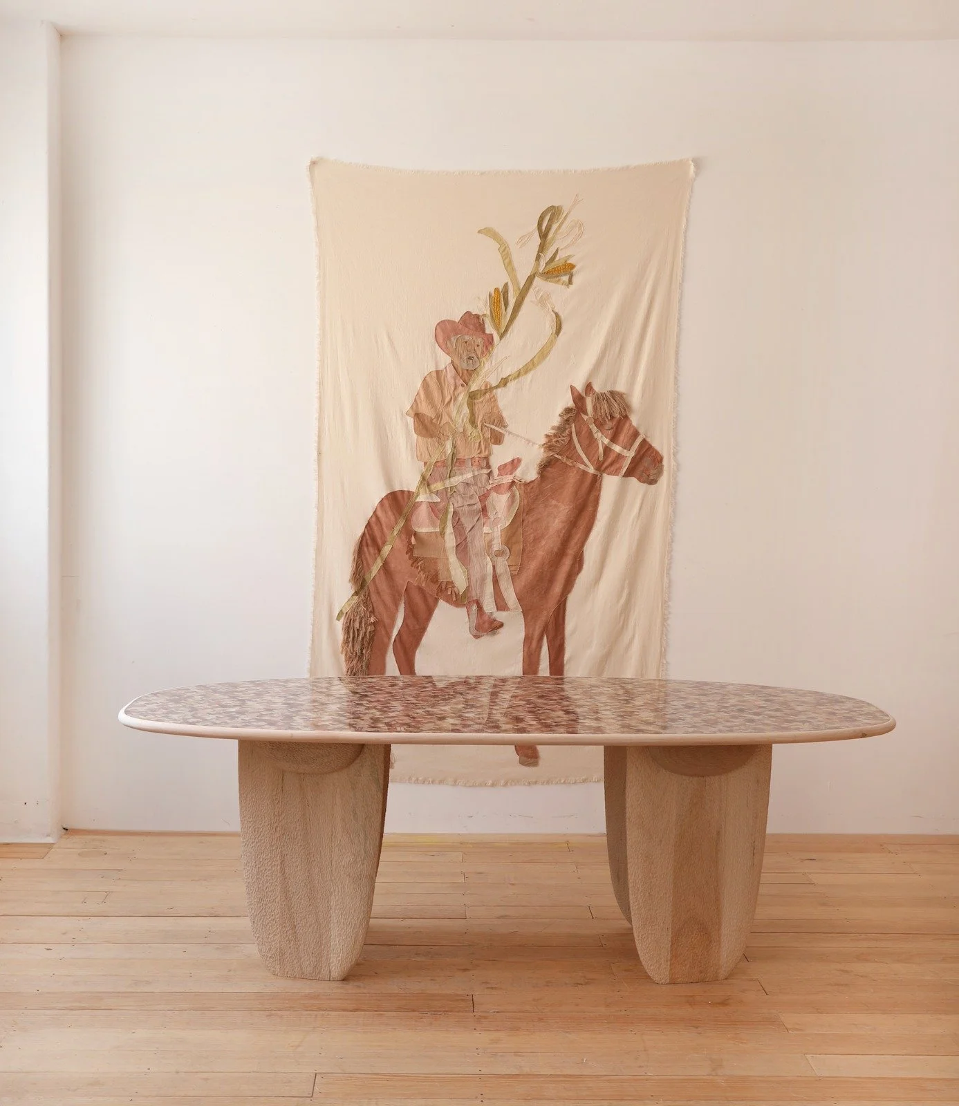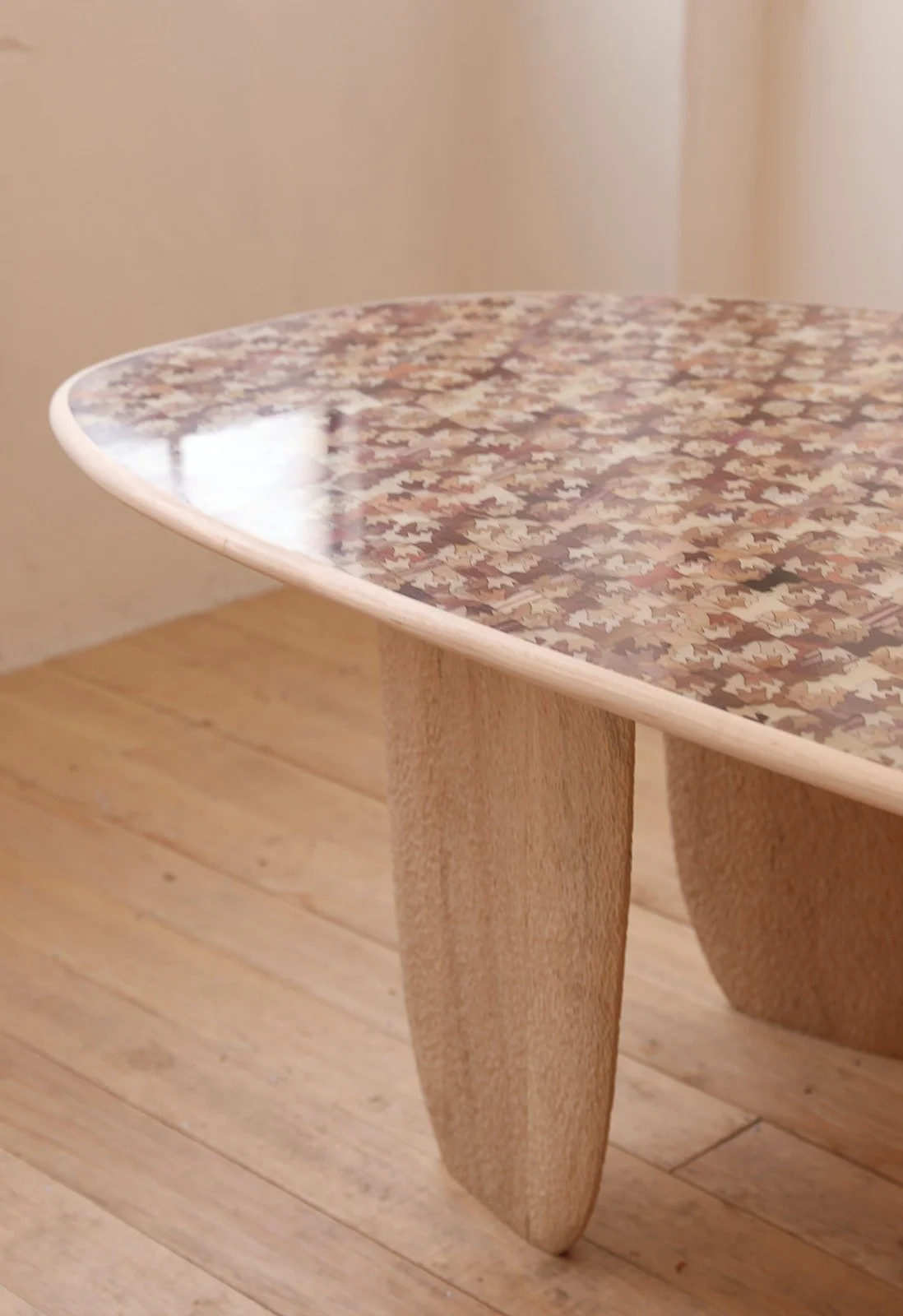 Totomoxtle is a new material that harnesses the brilliant spectrum of colour seen in the husks of heirloom corn. Varying from deep purples, to soft creams, Totomoxtle showcases the natural colour range of species of native corn that exist in Mexico. Each husk is carefully cut and peeled off the cob, ironed flat and glued onto a paper pulp or textile backing. At this point the material is ready to be cut by hand or laser into small pieces that are reassembled to make marquetry for furniture or interior surfaces.